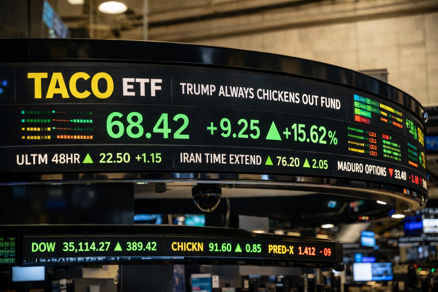 New York and the Strait of Hormuz — Charles Schwab launched a Trump Always Chickens Out exchange-traded fund (ETF) Friday (Ticker: TACO) to give ordinary Americans exposure to the now-reliable pattern of presidential threats, walkbacks, and victory declarations.