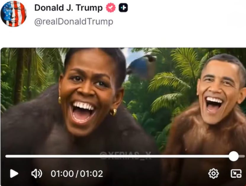 Washington, DC — The MAGAverse went into a tailspin Friday after President Trump deleted a video of the Obamas as Apes on his Truth Social account, leading supporters to fear the administration is “going woke.”