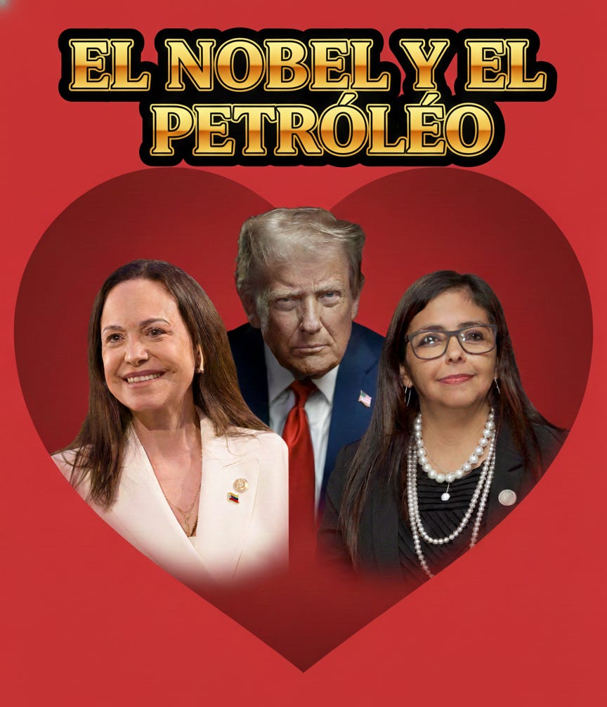 “Machado still doesn’t have the respect. But now I have a Nobel! Delcy doesn’t have a Nobel. But she has the oil! And is coy about offshore rights…. I wish Jeffrey were here. He’d know what to do. Putin and Zelenskyy make it so much easier…”