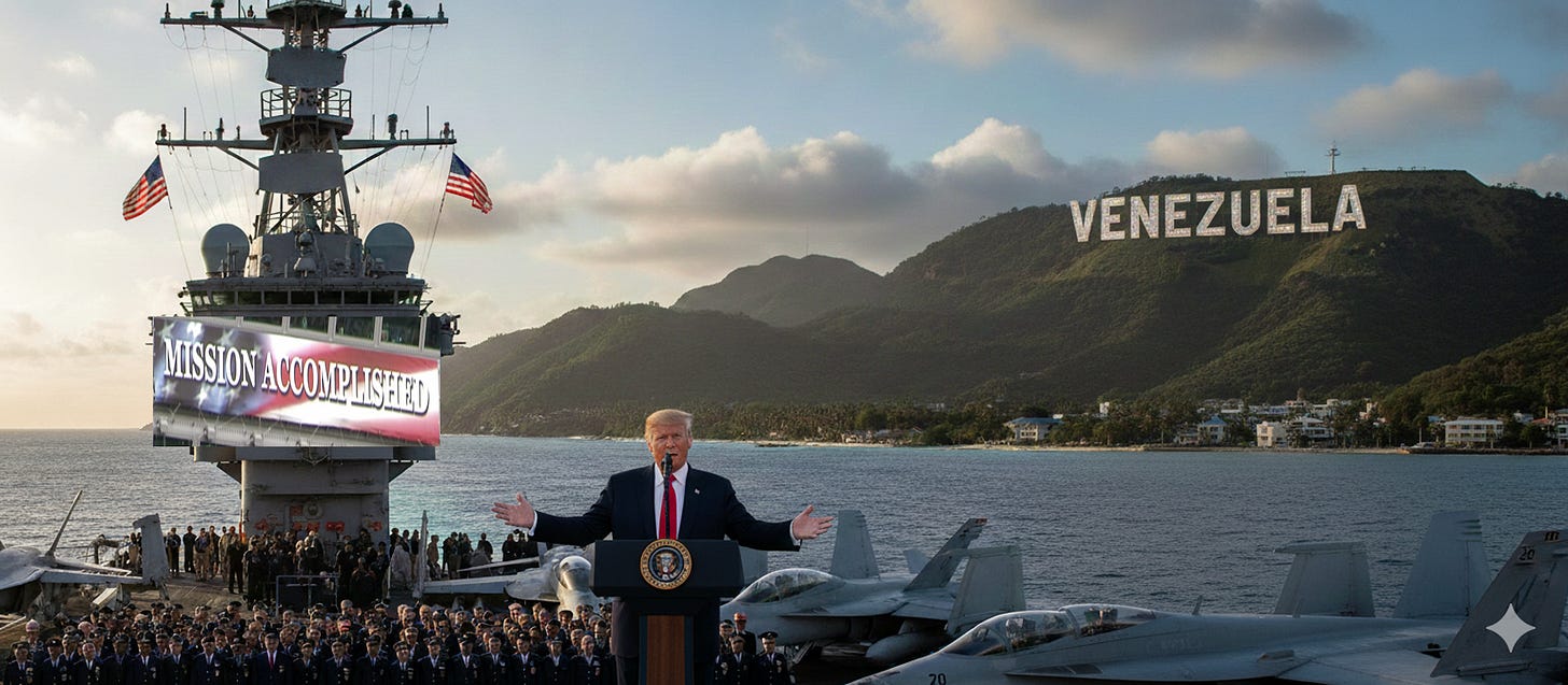 Off the Venezuelan Coast — Standing beneath a “Mission Accomplished” banner found in a box marked “Don’t Reuse!” in the corner of the Oval Office, President Trump told troops aboard the USS Gerald R. Ford that the United States had “totally fixed Venezuela.”